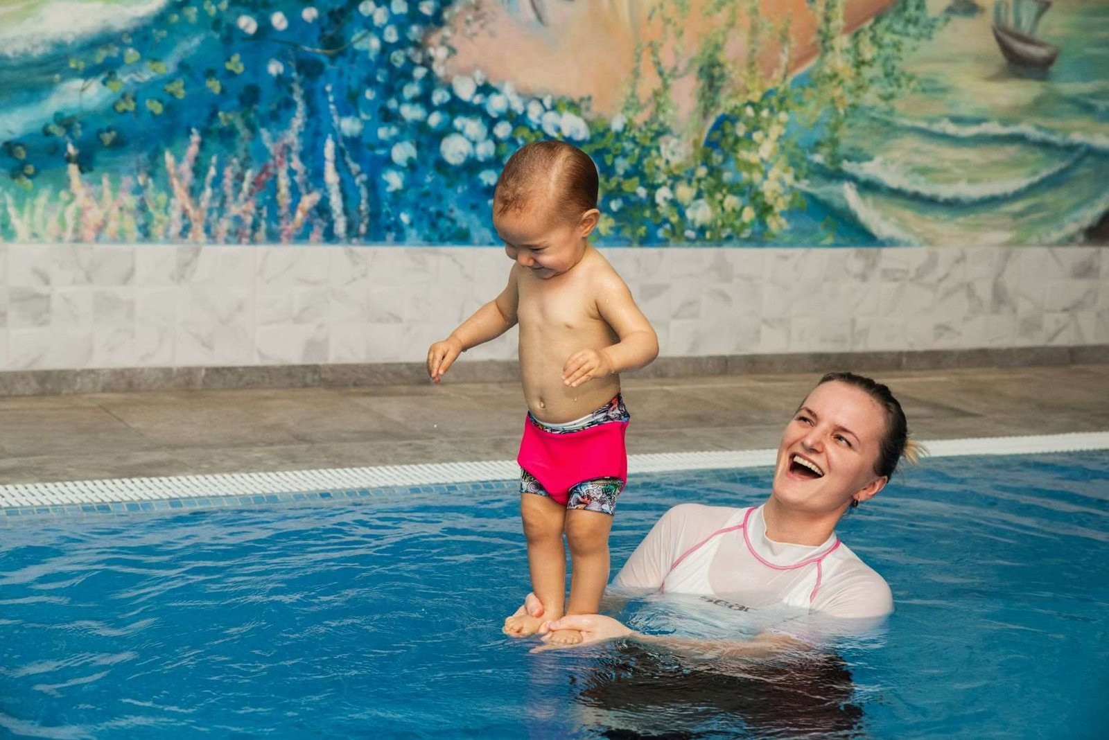 The modern pool, equipped with the latest overflow system and underwater massage jets, is the first of its kind in Kaunas for toddlers. The pool and water are kept clean to the highest hygiene standards. The water is cleaned 24 hours a day, and there is automatic dosing and ultraviolet irradiation equipment. Professional physiotherapists are always on hand to supervise the staff. So mums and their little ones can feel really safe here.