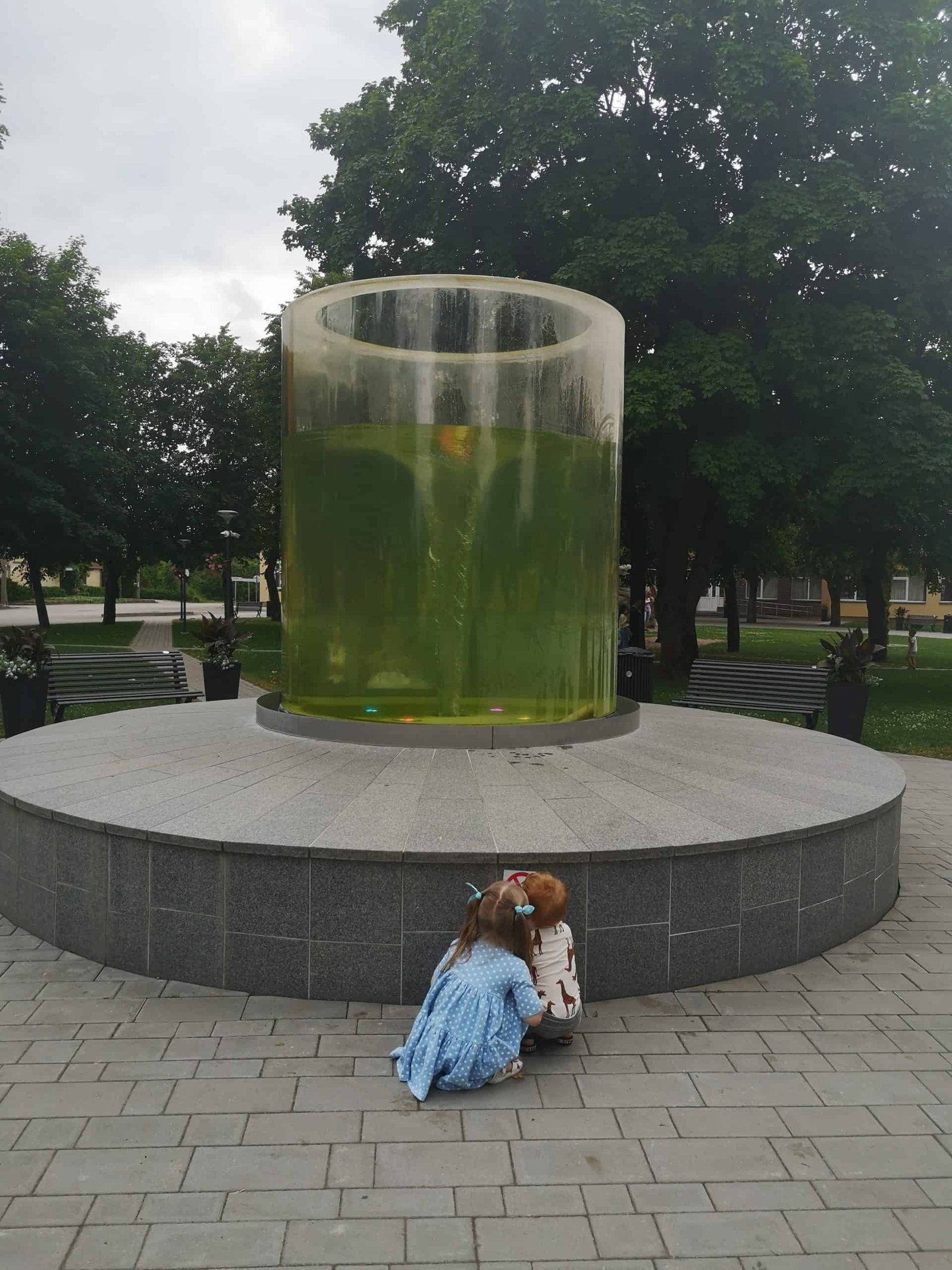 Traveling further from the city, you will reach the Butrimoniai city fountain. The fountain is located in the center of Butrimoniai town, in the only triangular square in Lithuania. The fountain is in the shape of an acrylic flask, with a huge whirlpool of water spinning inside. Water flows through the wall of the fountain, which creates a unique sight. After dark, the fountain lights up in different colors. Such a fountain is the only one in Lithuania.