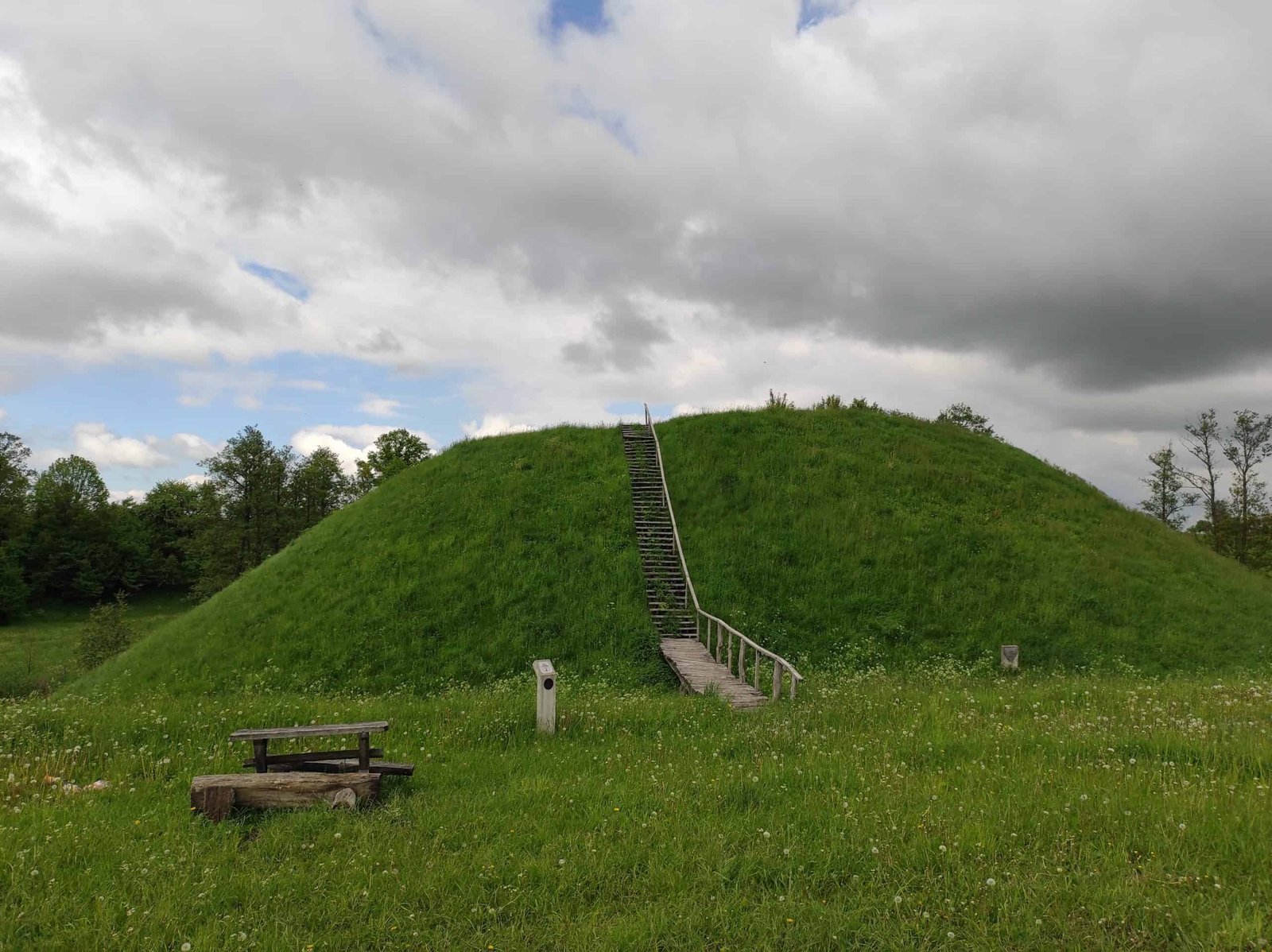Traveling further, you will come to a small Bambininkai mound. You will not find a place to park your car here, you will have to leave it right on the edge of the street. The mound, like the mounds of Kaukai and Obelytė, will appear to be forgotten by everyone: everything is covered with tall grass.