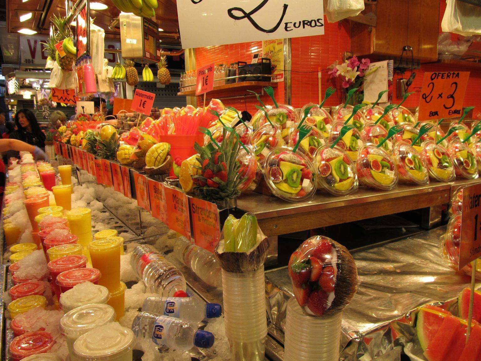 Here you can grab a bite to eat and try Spanish tapas, have a more serious meal, or simply enjoy some fresh fruit or fruit juice.