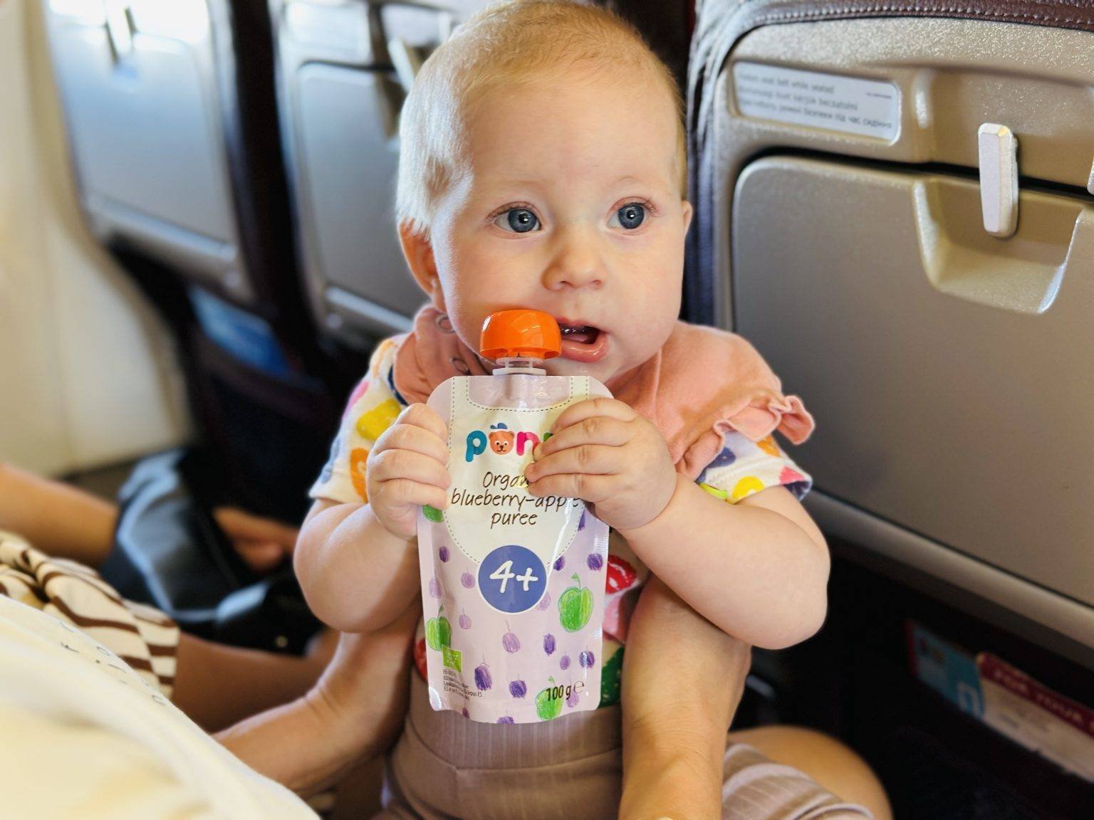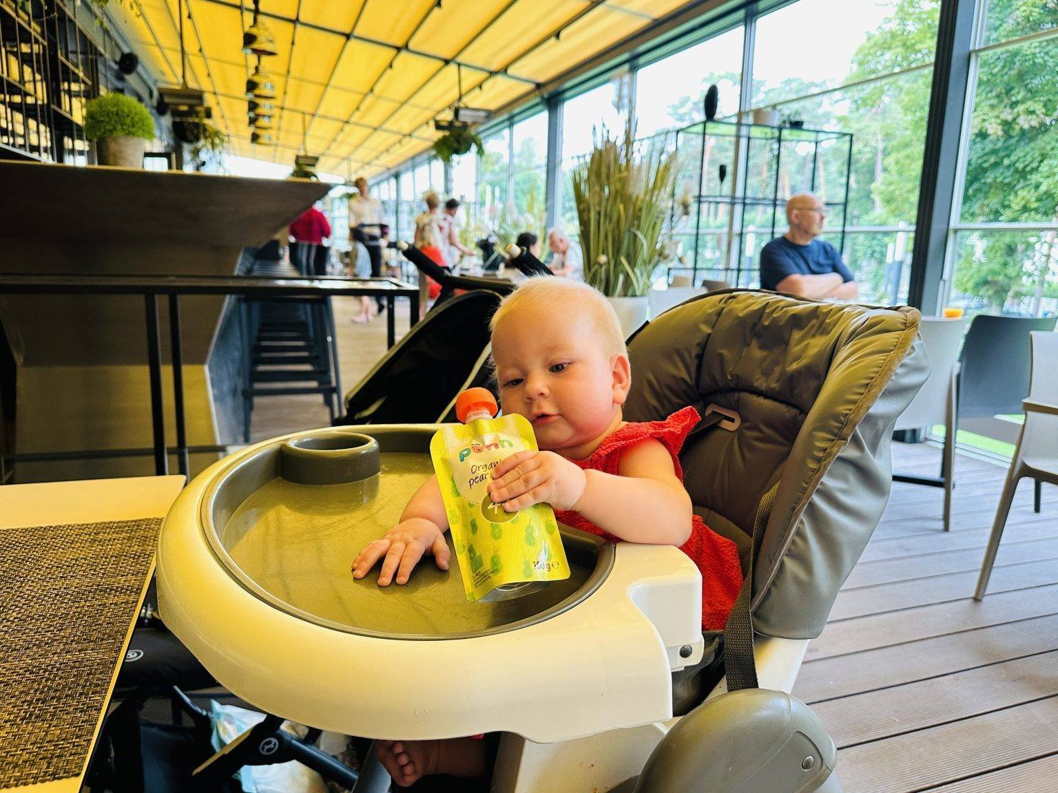 No problems when travelling with Paulė either. While Paulė is still small, she eats the oat porridge. When travelling, all you need to take with you is a thermos of warm water, or you can ask for hot water on the plane, in a café, a small bowl, a spoon, some porridges and PONN purees.