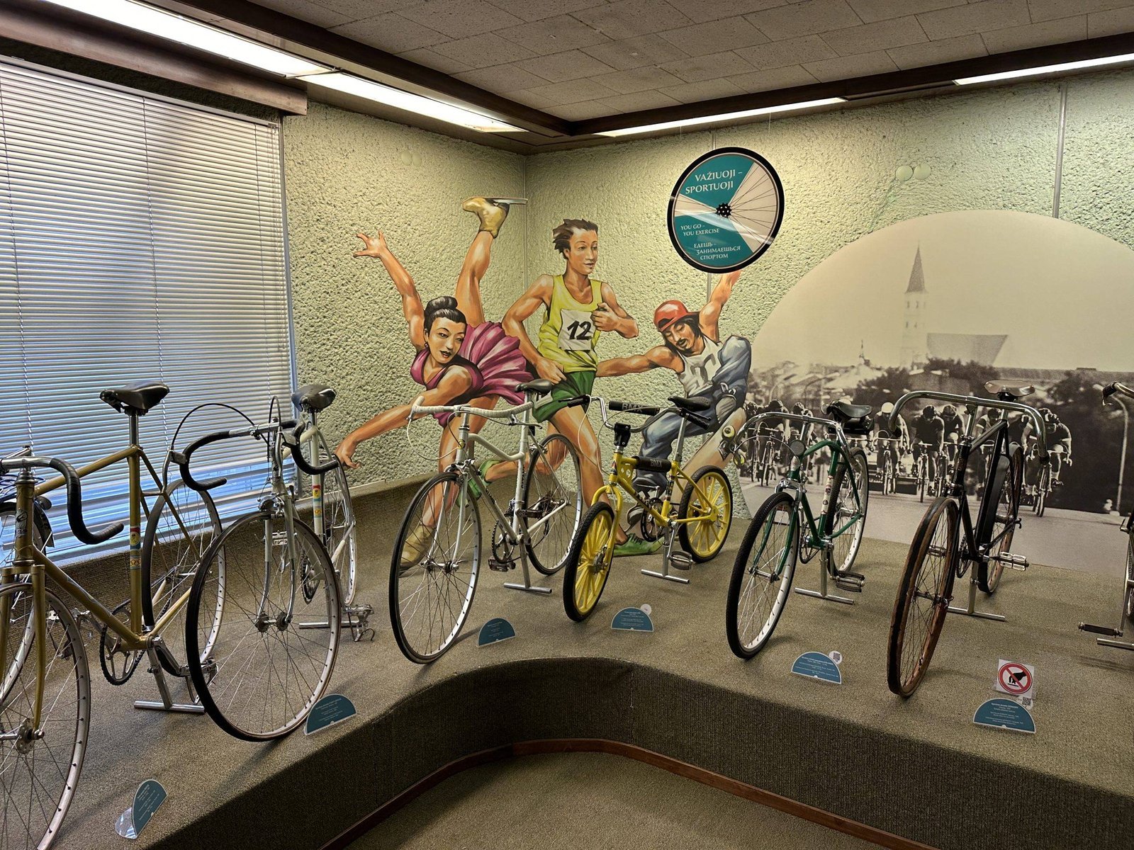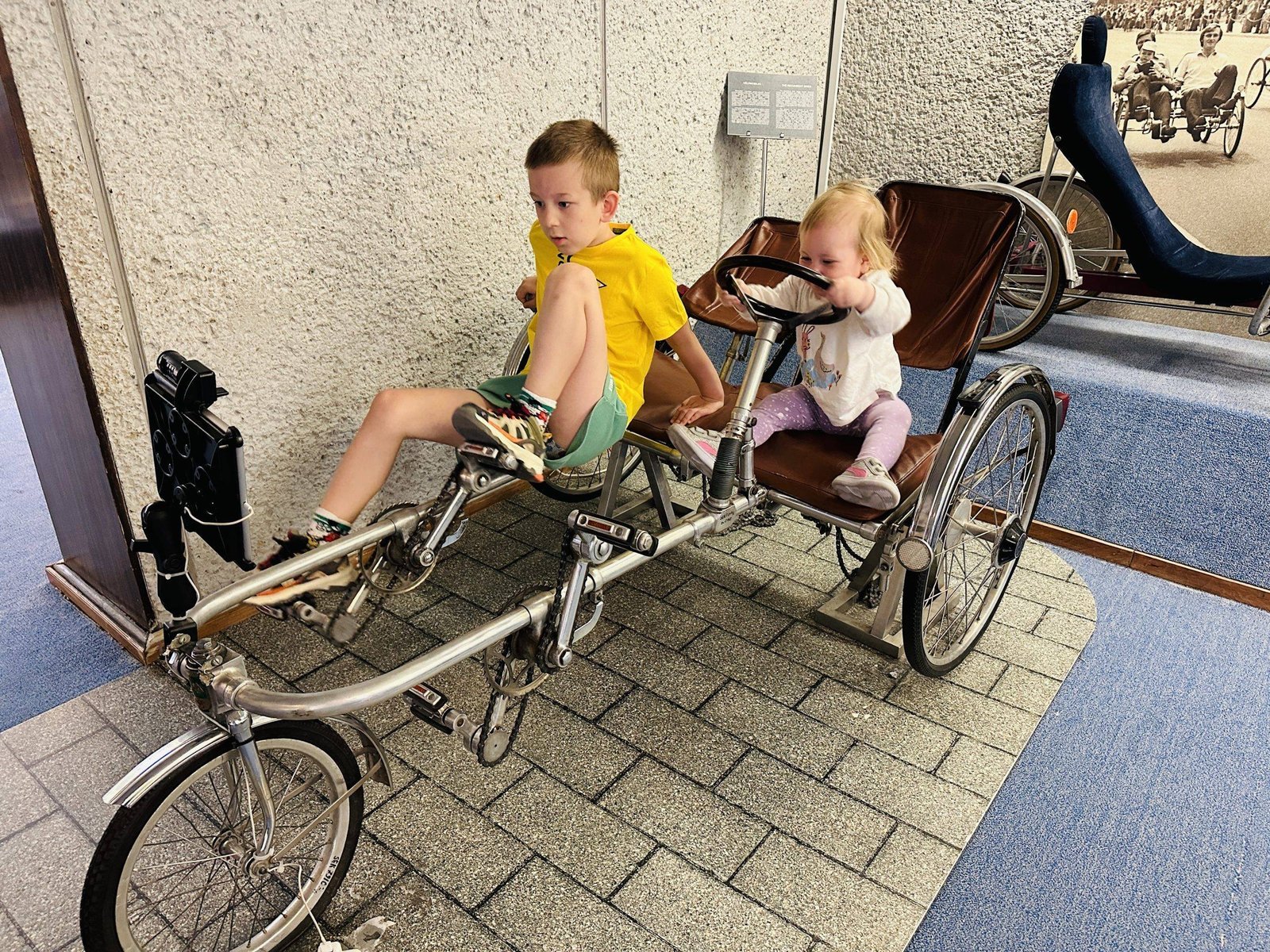 On the ground floor of the museum, adults and children alike can try out a vintage bicycle. It is based on drawings dating back almost five centuries. On the second floor, you can test drive a velomobile, and on the third floor, road bikes. It was really interesting to show the children what the bicycles of our childhood looked like. And the funniest part was to see the orange Vilnius city bike in the museum, remember those?