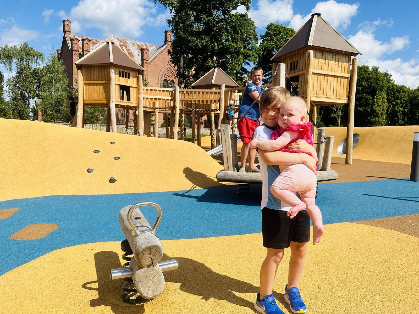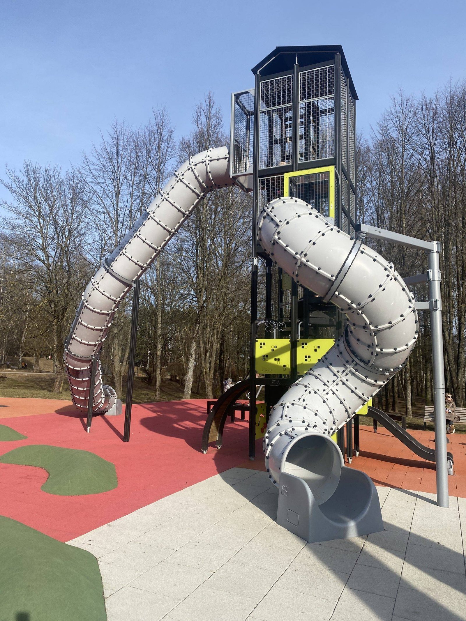 A new playground was built a few years ago in the Alytus Youth Park. And is a must-visit if you’re coming to Alytus with children. This playground is quite large with a wide variety of activities and facilities suitable for both younger and older children and their parents. There are various swings, a volleyball court, a roller-skating area, and the pumptrack, which our son Motiejus loves so much, one of which is the biggest in Lithuania. There are also many stairs, an 8 metre high activity tower, educational boards, trampolines, balance platforms, carousels. Little ones can play in the playhouses and the lower activity tower.