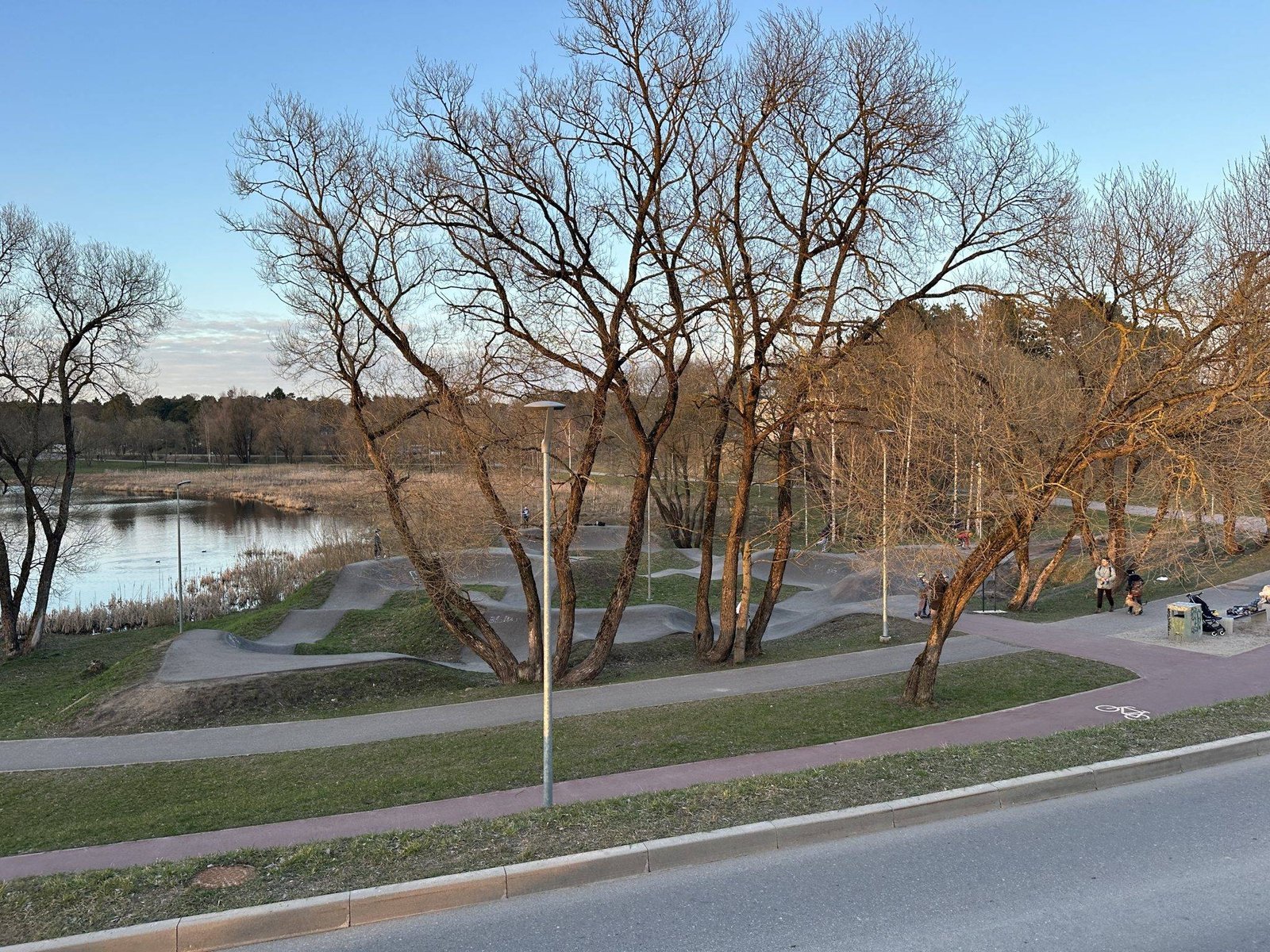 There is also a skate park. The leisure area includes a small sports complex. You can play basketball and other games. The sports complex is fenced, large. There are also fitness equipment nearby. The whole environment is very tidy, even though this is not the first year this space has been open. There is also a stroller available, and there is a Toi Toi toilet nearby. It is very convenient that there is also lighting, so you can go for rides, play and exercise after dark. This is especially important in autumn when it gets dark early.