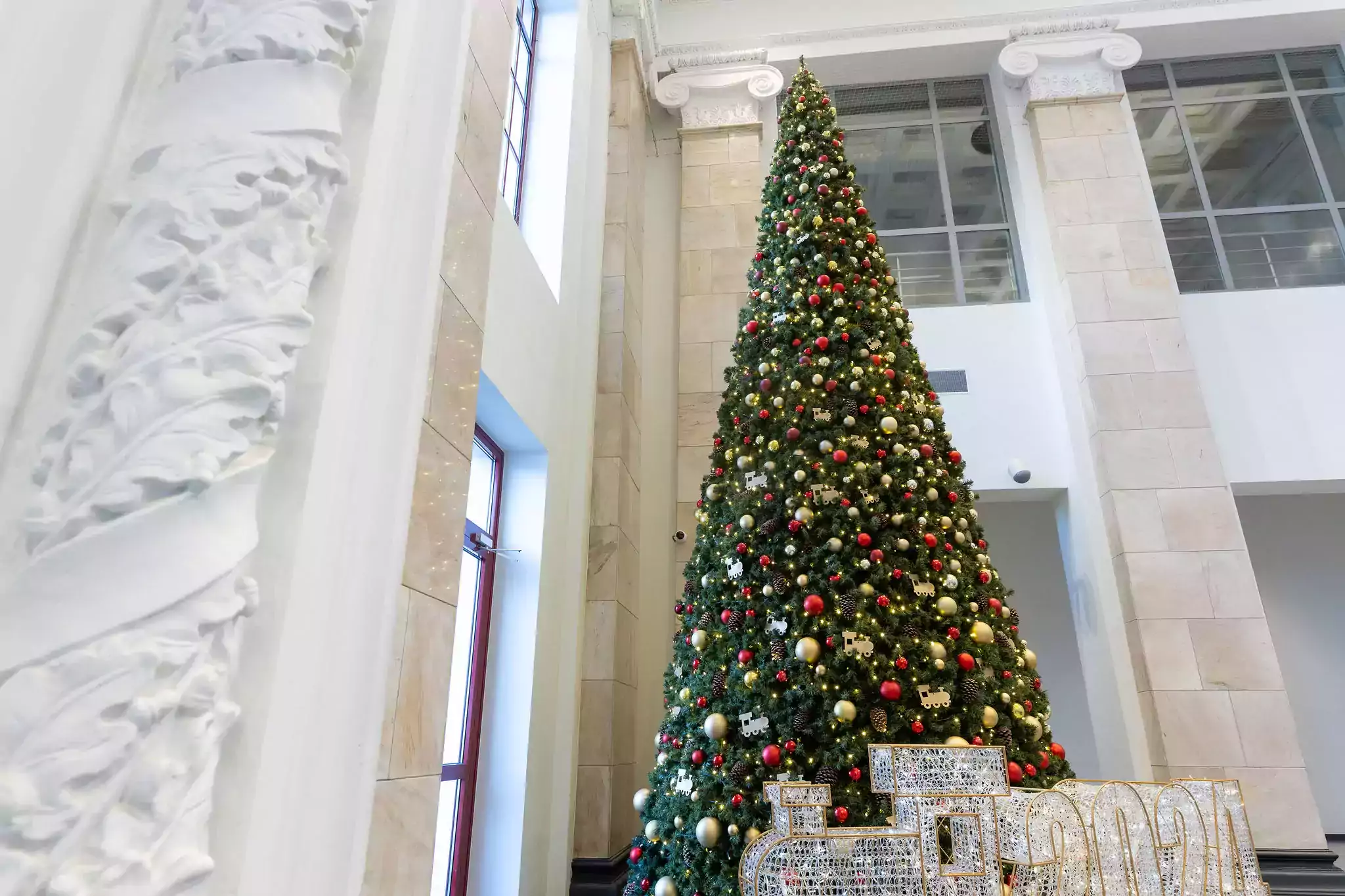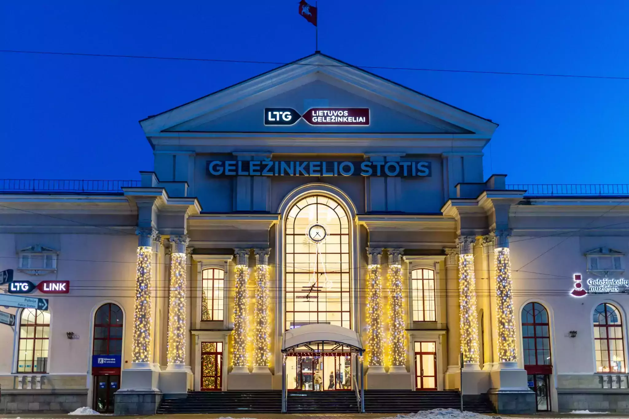 As the festive season begins, the Vilnius railway station is decorated with Christmas decorations. Even before entering the station, passengers are greeted by the decorated facade of the historic building. The building with a 7.3-meter-high green lantern is lit in the main waiting room, and festive decorations are on the first platform.