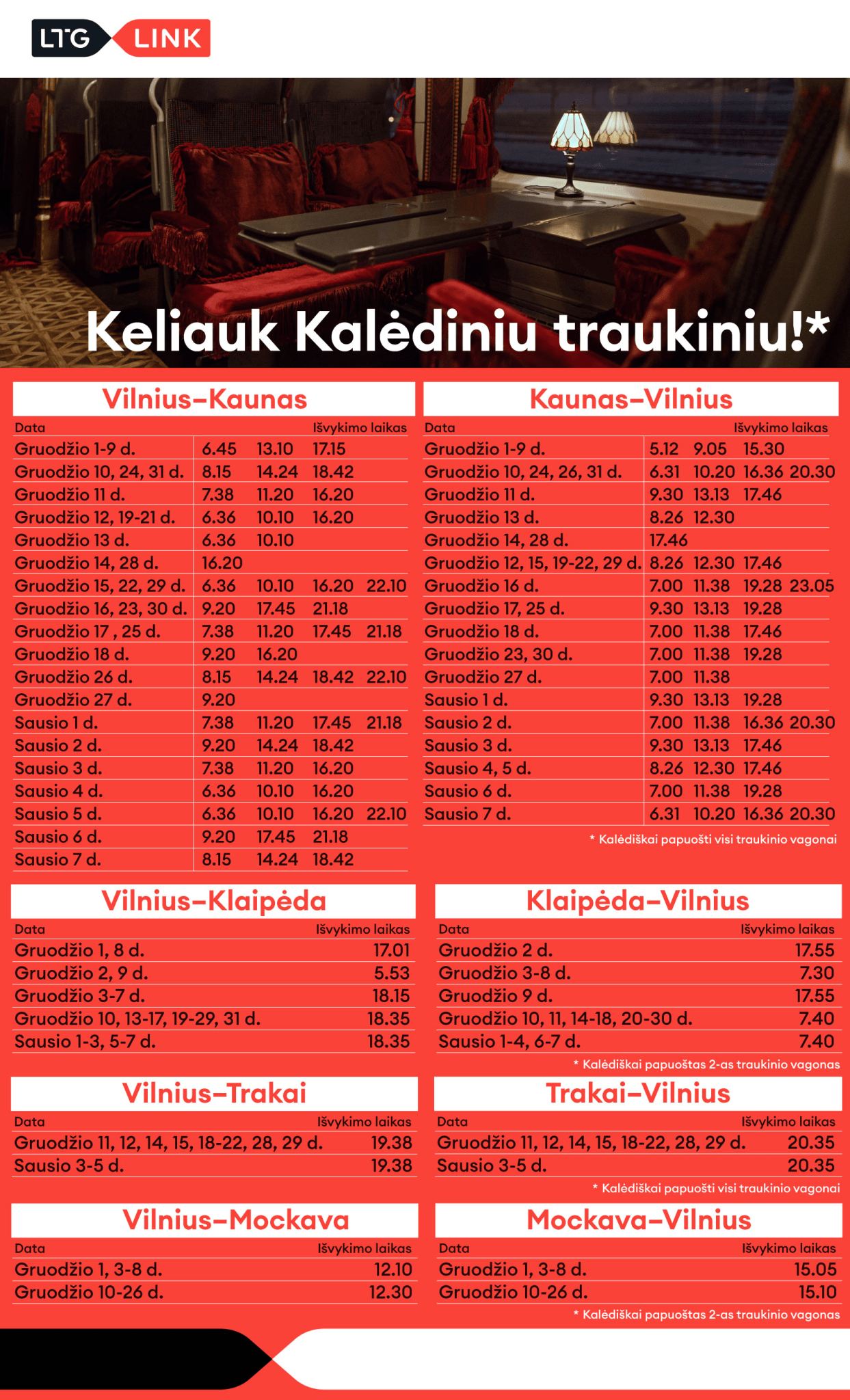 LTG Link trains, which create a festive mood, will return to the country’s railways for the third time this year. Passengers will be able to travel on trains that have already started running until January 7. This year, customers will be able to choose from three trains running on various routes. These routes are Vilnius–Klaipėda, Vilnius–Kaunas, Vilnius–Trakai and Vilnius–Mockava. Go Vilnius is giving away the last festive joint trips to Warsaw this year.
