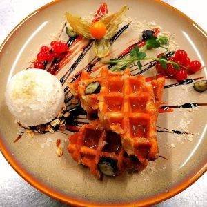Pizzas, sandwiches, Belgian waffles, salads, main courses and desserts.