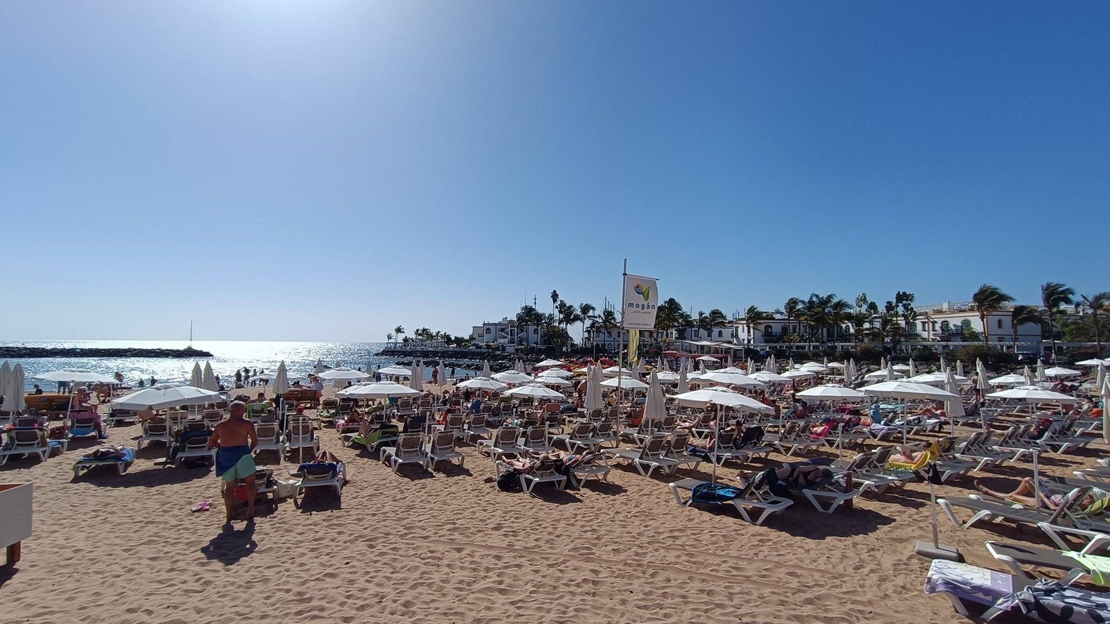 The beach at Puerto de Mogán is small but white sandy and ideal for children. The water is calm and warm, thanks to the natural rocks that protect the bay from strong waves and currents.