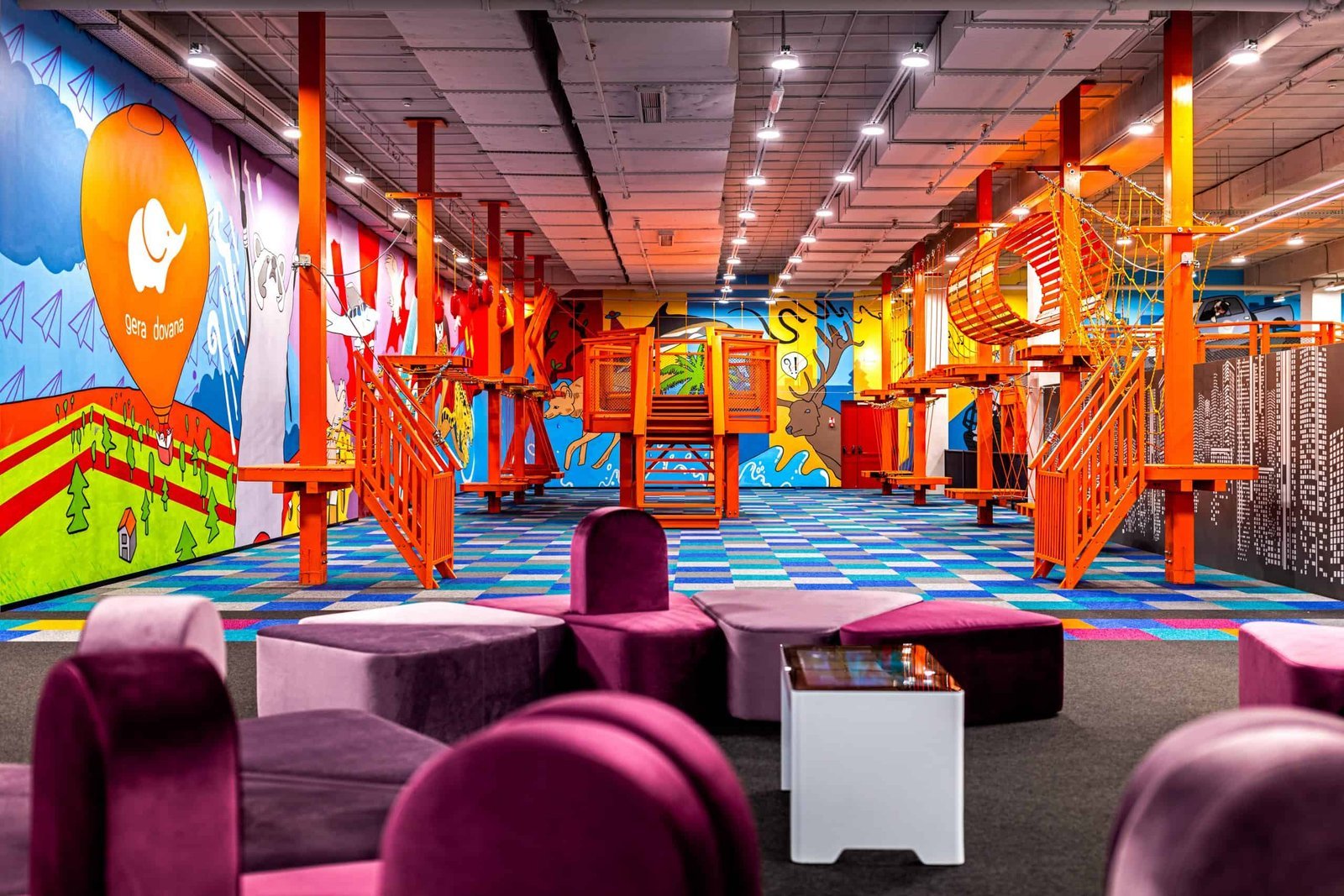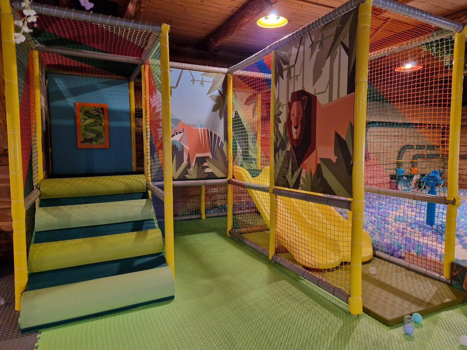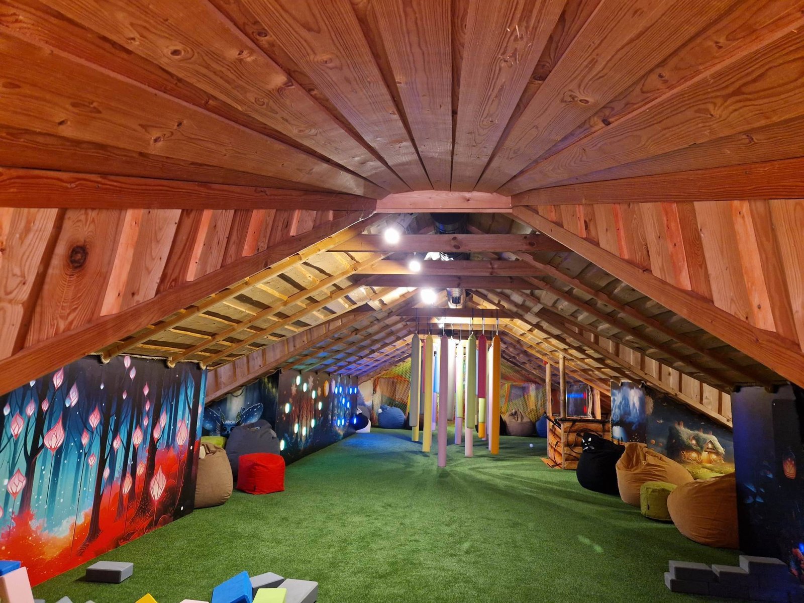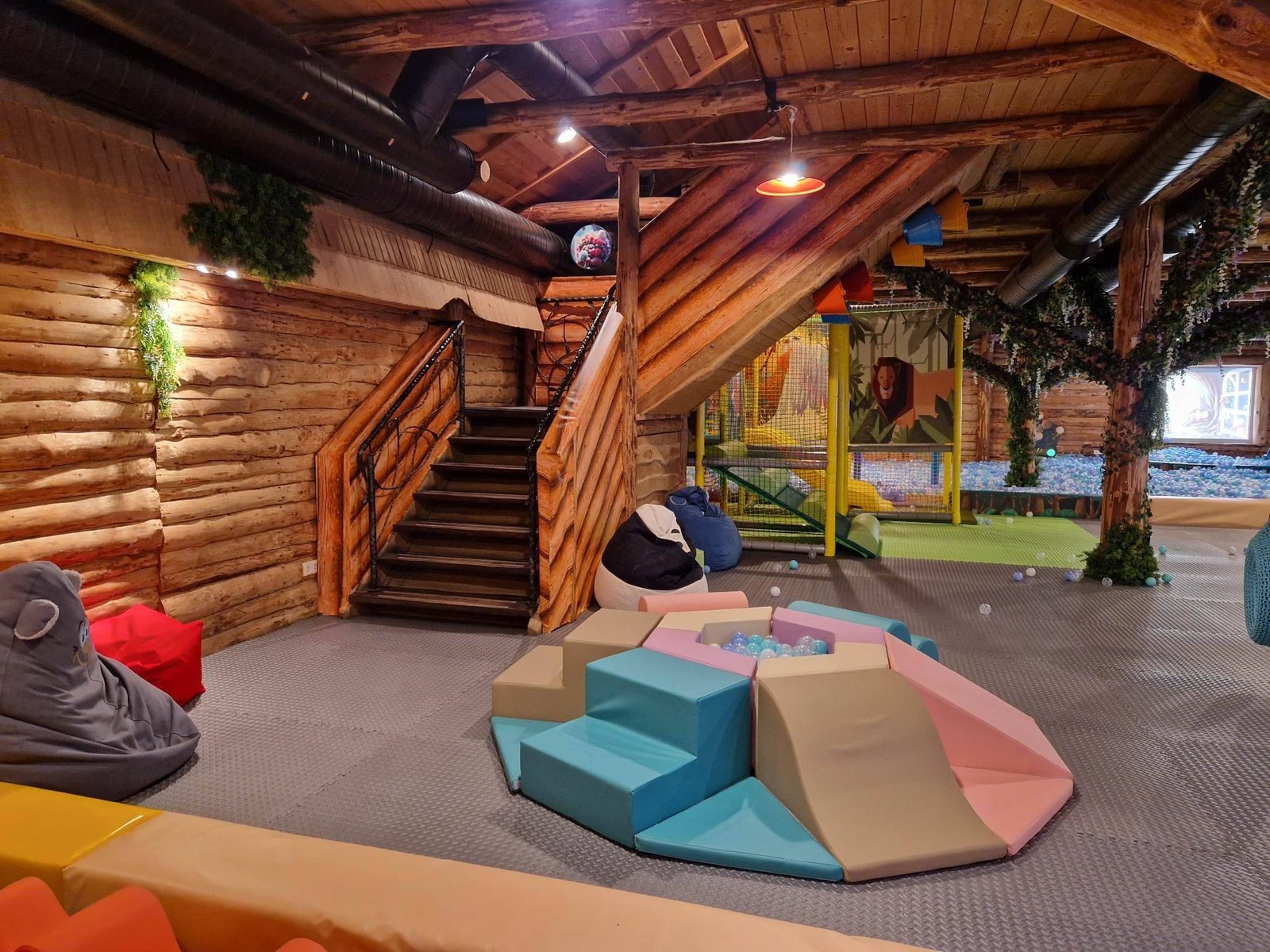Climbng frames, a corner of soft blocks, mystery hiding spots, balls, interactive games and virtual space, labyrinths.