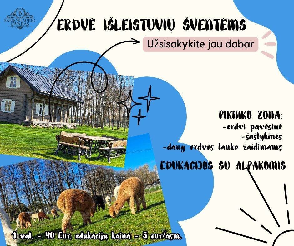 Barborlaukis Manor invites you to celebrate with your children in its spacious manor territory with a gazebo, picnic area and barbecue grills. It also offers educational activities with alpacas for children!