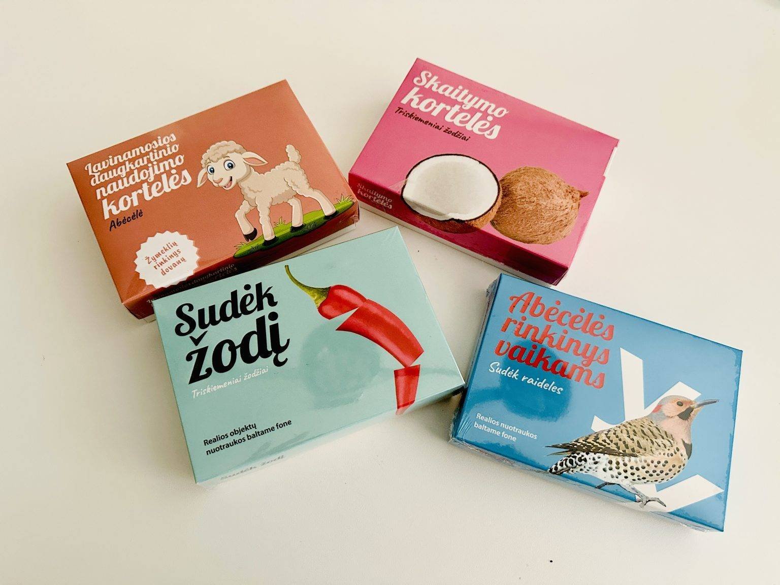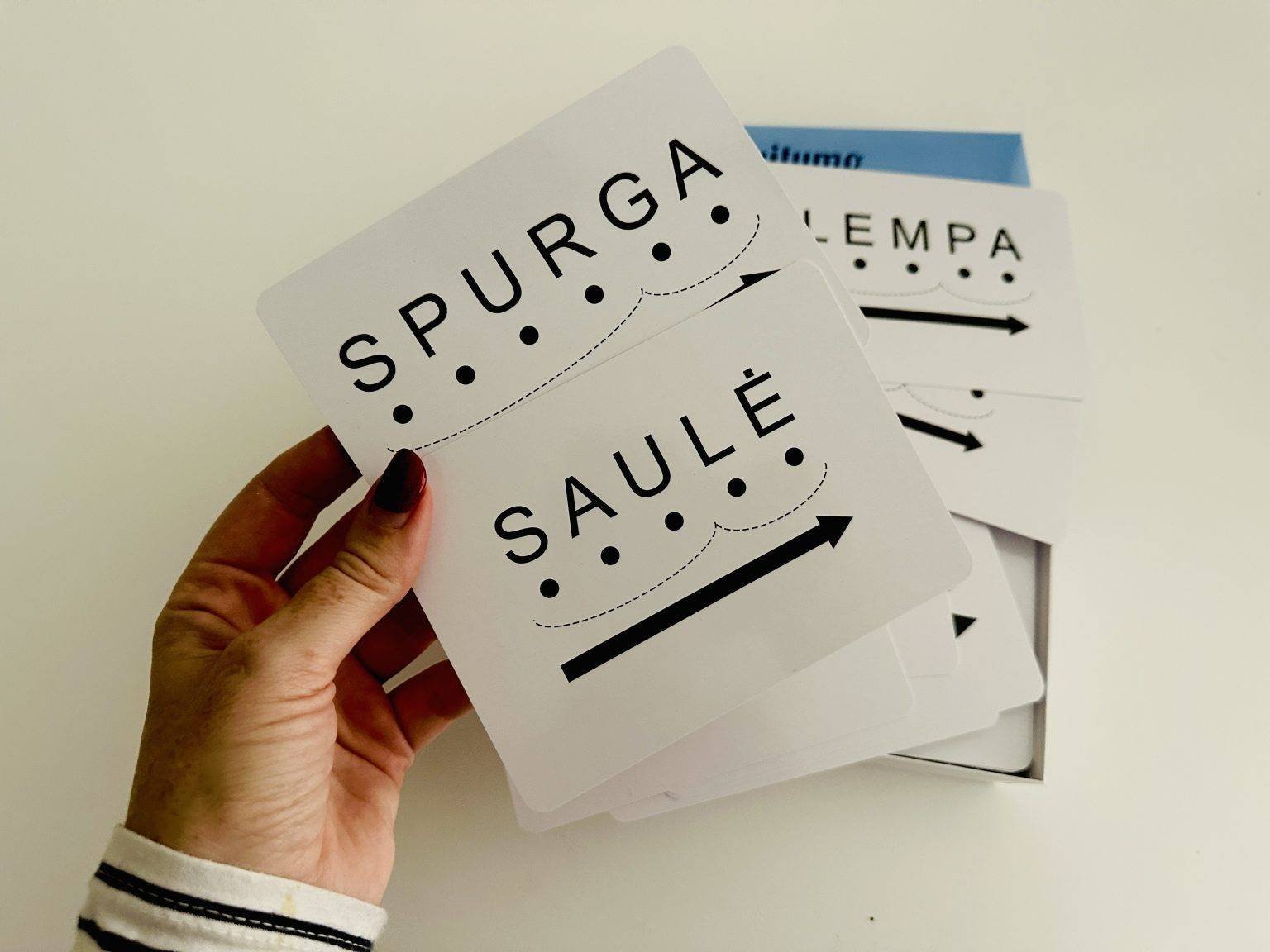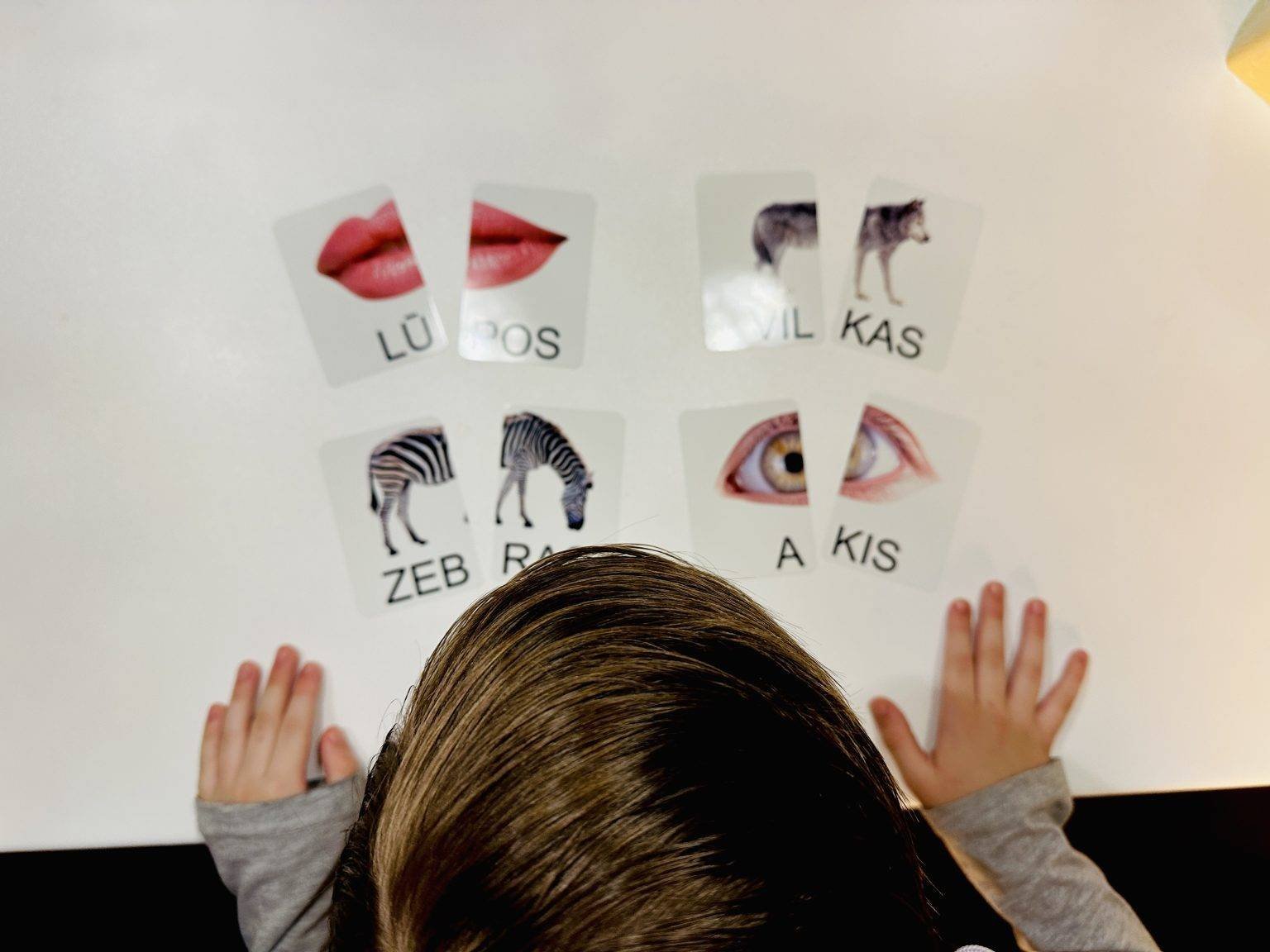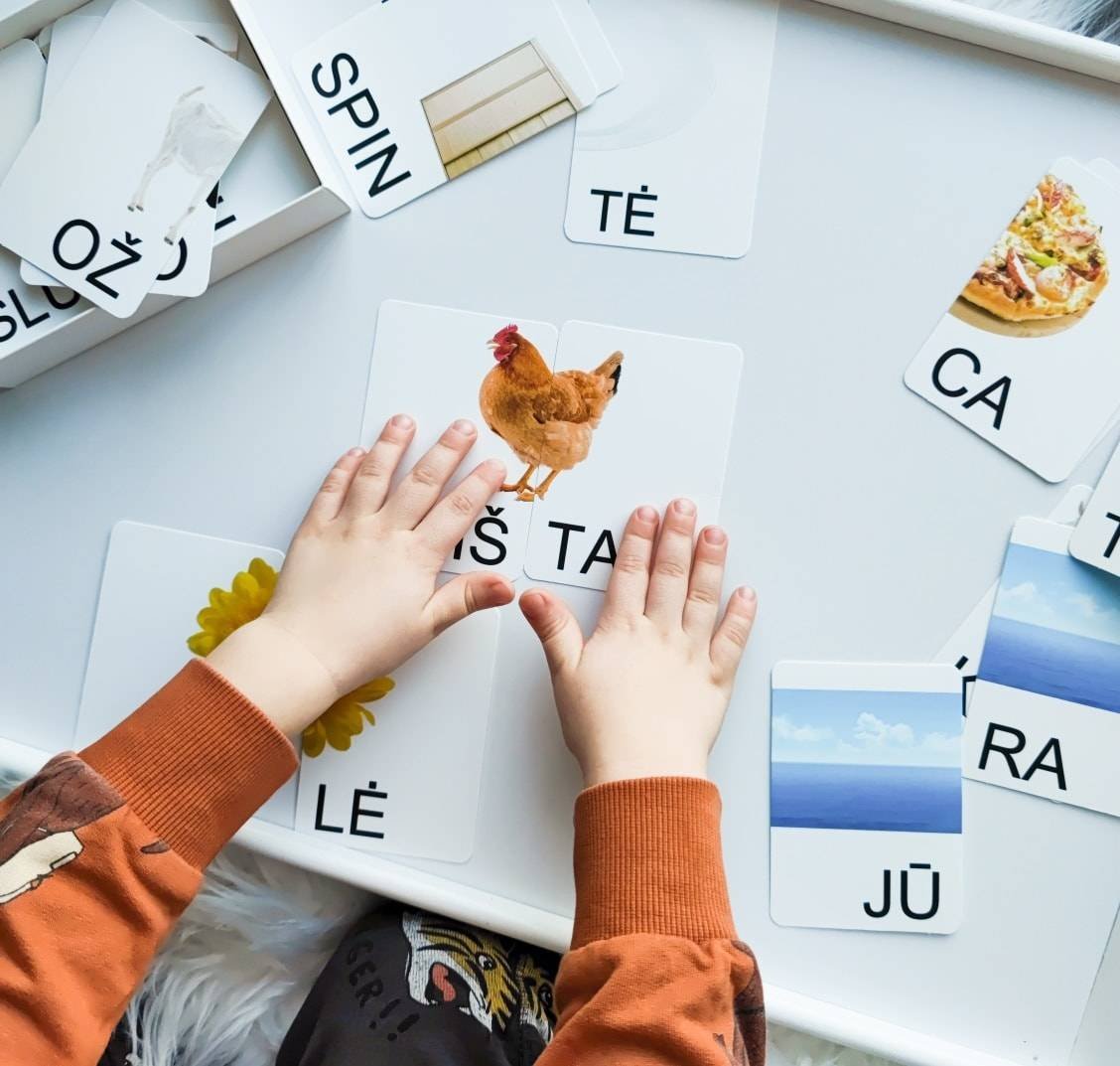 In the kit you will find a word card and a corresponding picture card. For example the word “KATĖ” (a great english two-syllable word could be lion). Ask your child to name all the letters: “k”, “a”, “t”, “ė”.