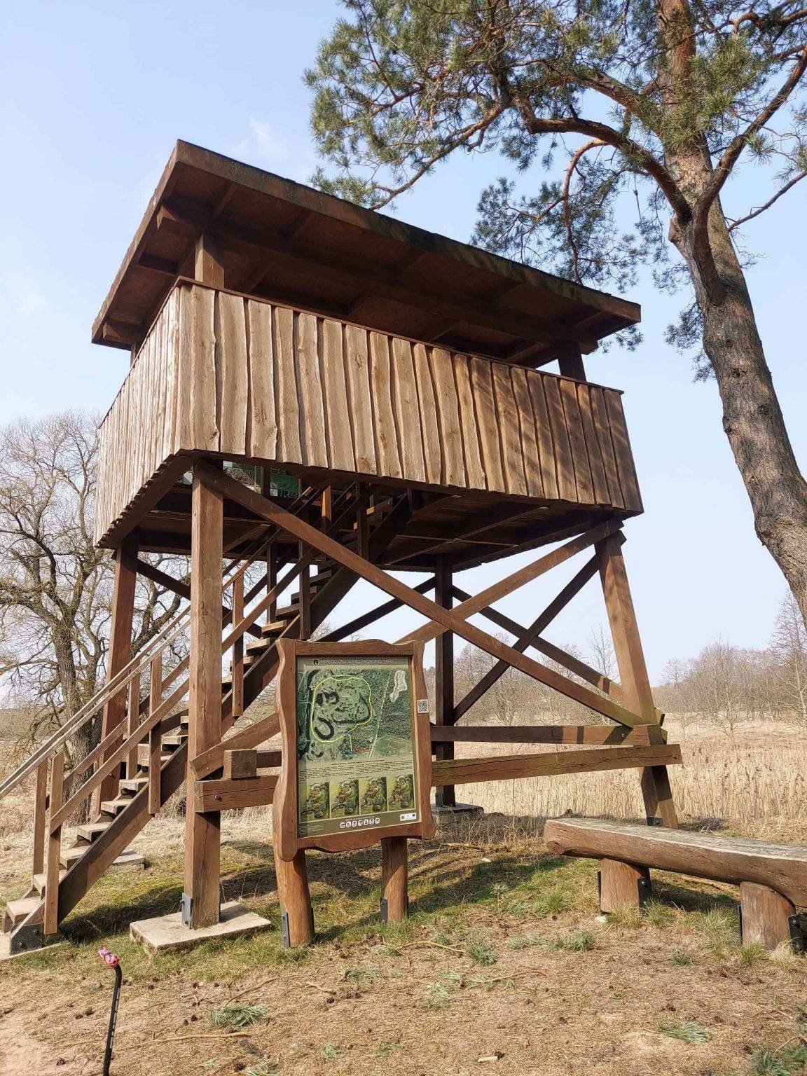 You can easily find the trail by turning south, about 2 km from Krekenava. The location of the trail is indicated by the road sign on the right. The infrastructure of the trail is well organized – there are children’s playgrounds, rest areas, benches with tables, changing cabins, outdoor toilets. – everything you need for a fun and comfortable vacation. The trail starts at the sign “Link to old men”, after a short walk you can immediately see a 6 m high observation tower.