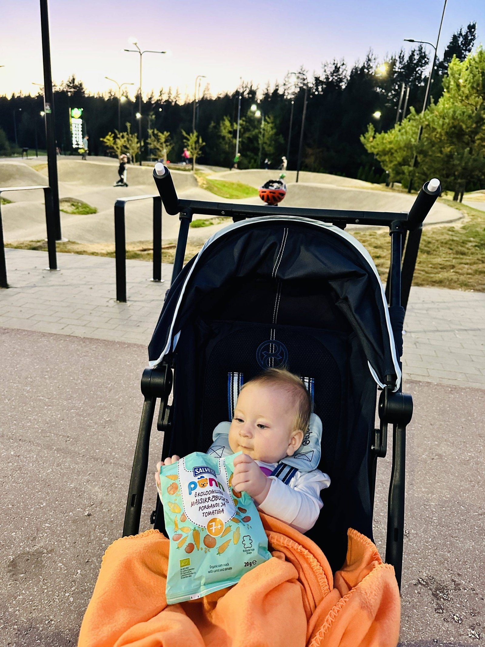 We come here to spend time as a family. Meanwhile, Motiejus rides, and we drink coffee or eat take-out wok on the bench. Also, do not forget to bring snacks with you, because they are always needed. We always bring the tastiest PONN corn snacks and purees everywhere. Moreover, you can find all playgrounds in Vilnius in the article called Best Playgrounds in Vilnius.