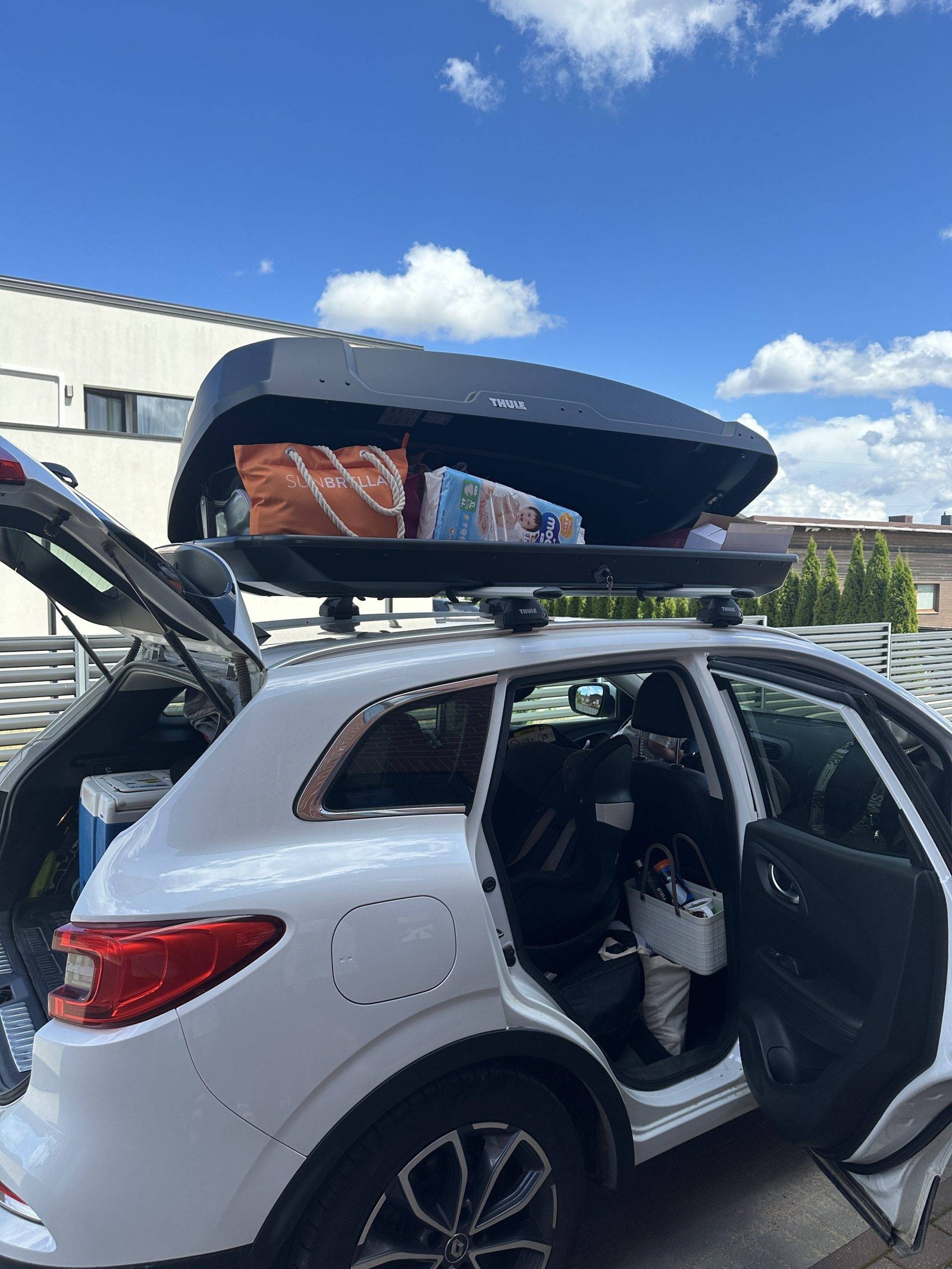First of all, a roof rack provides a lot of space for your belongings. Strollers, scooters, bicycles can easily fit in the roof rack. Also, things, clothes, shoes. What is very important for us personally is that a roof rack makes it very easy to keep the car tidy, because you can put everything in order and keep only the essentials in the boot.