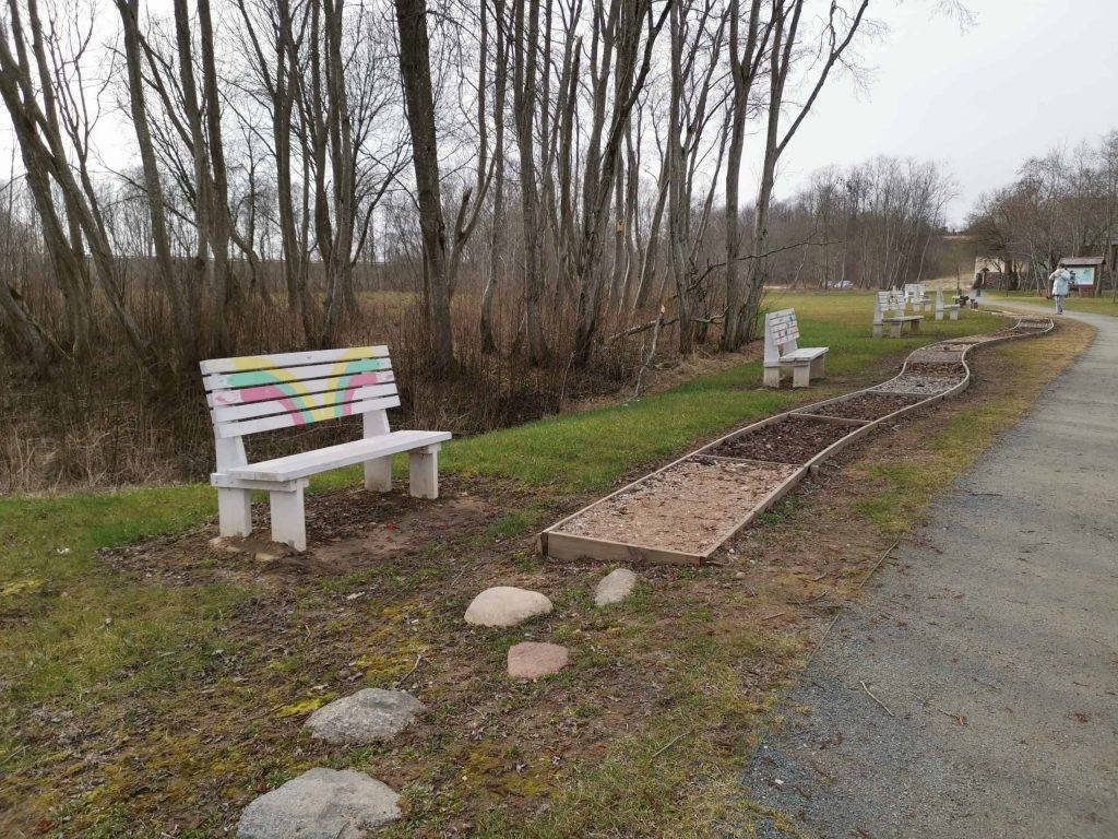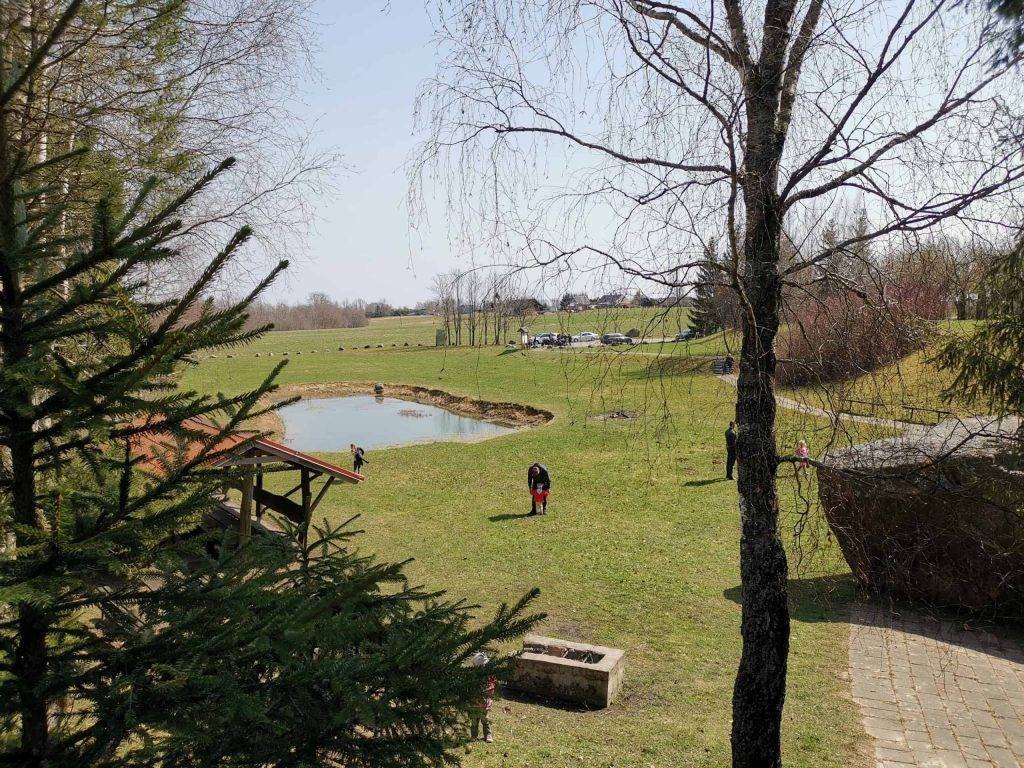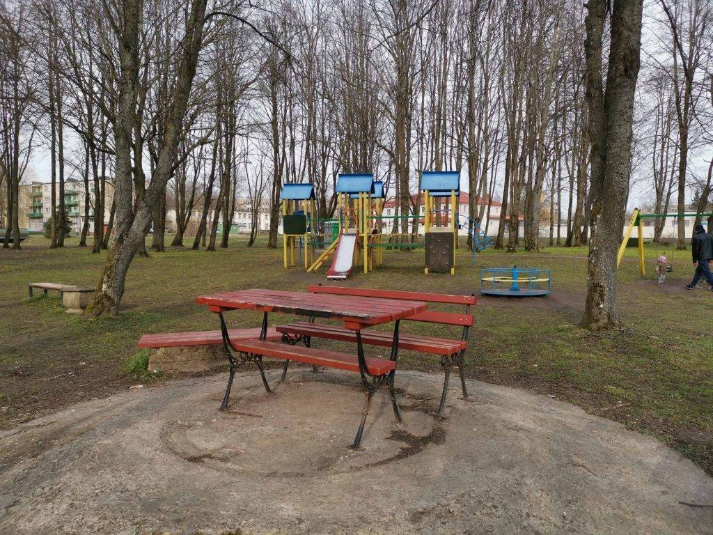 As usual for parks, there is no shortage of benches in this one as well. And of course, the park is really suitable for a family traveling with a baby. However, I would be very doubtful about the place to change the baby, well, unless you go to a catering establishment and there you might have that option (we traveled during strict restrictions, so we couldn’t really check it). And of course, next to the park, there is the pond of the city of Skuodas, which the locals call “the Sea of Skuodas”.