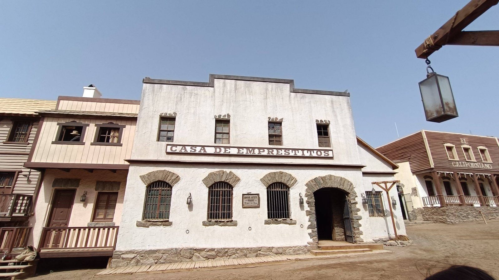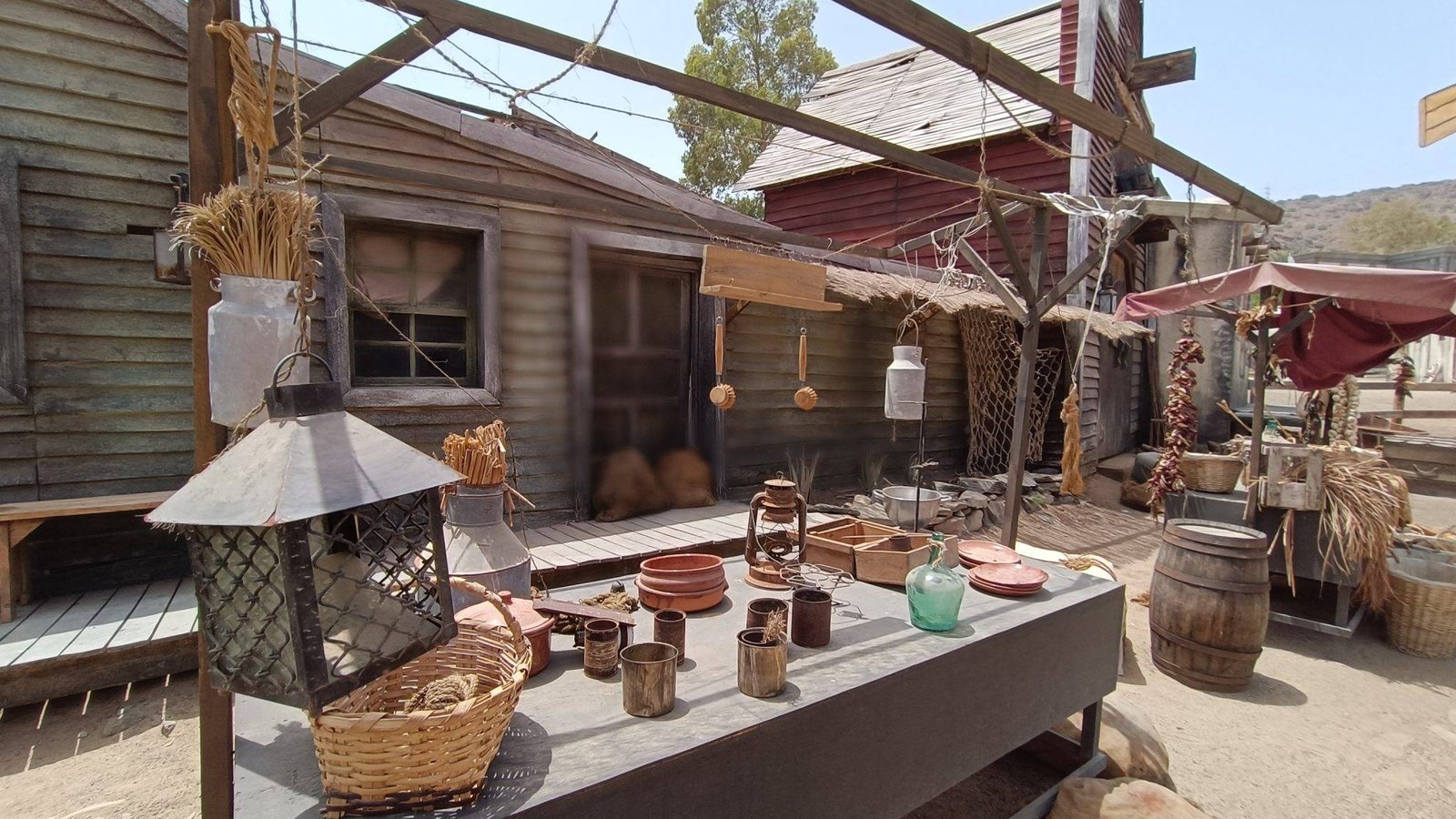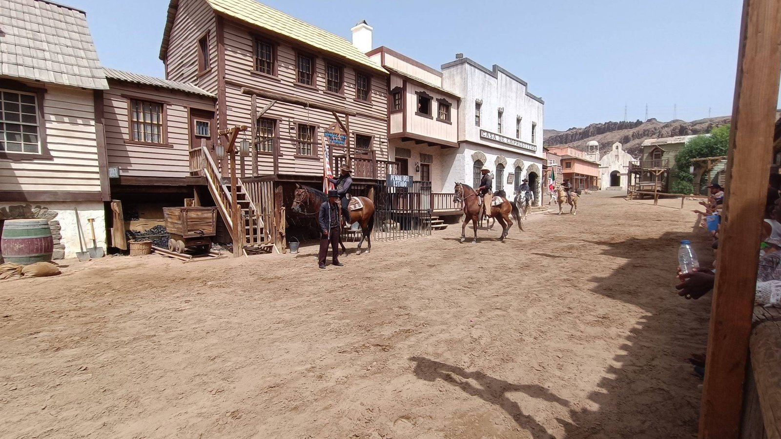 On the main street you can find a school, a barber shop, a blacksmith shop and a western saloon, with a church and a cemetery in the back. There is also a Mexican village and an Indian reservation nearby. Country music is playing in the saloon, and a fight breaks out when shooting suddenly starts. It invites visitors to experience the feel of the old wild west life.