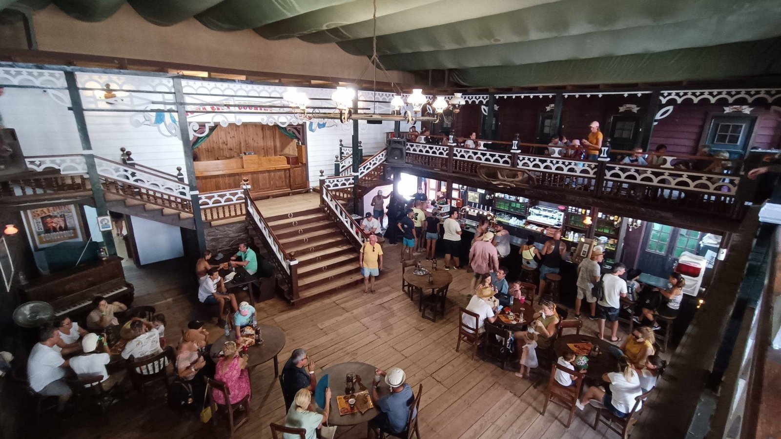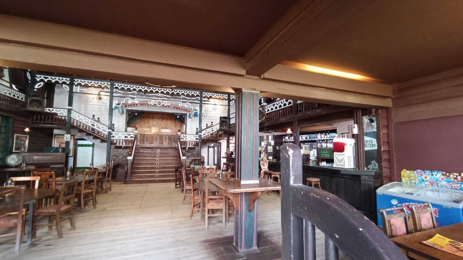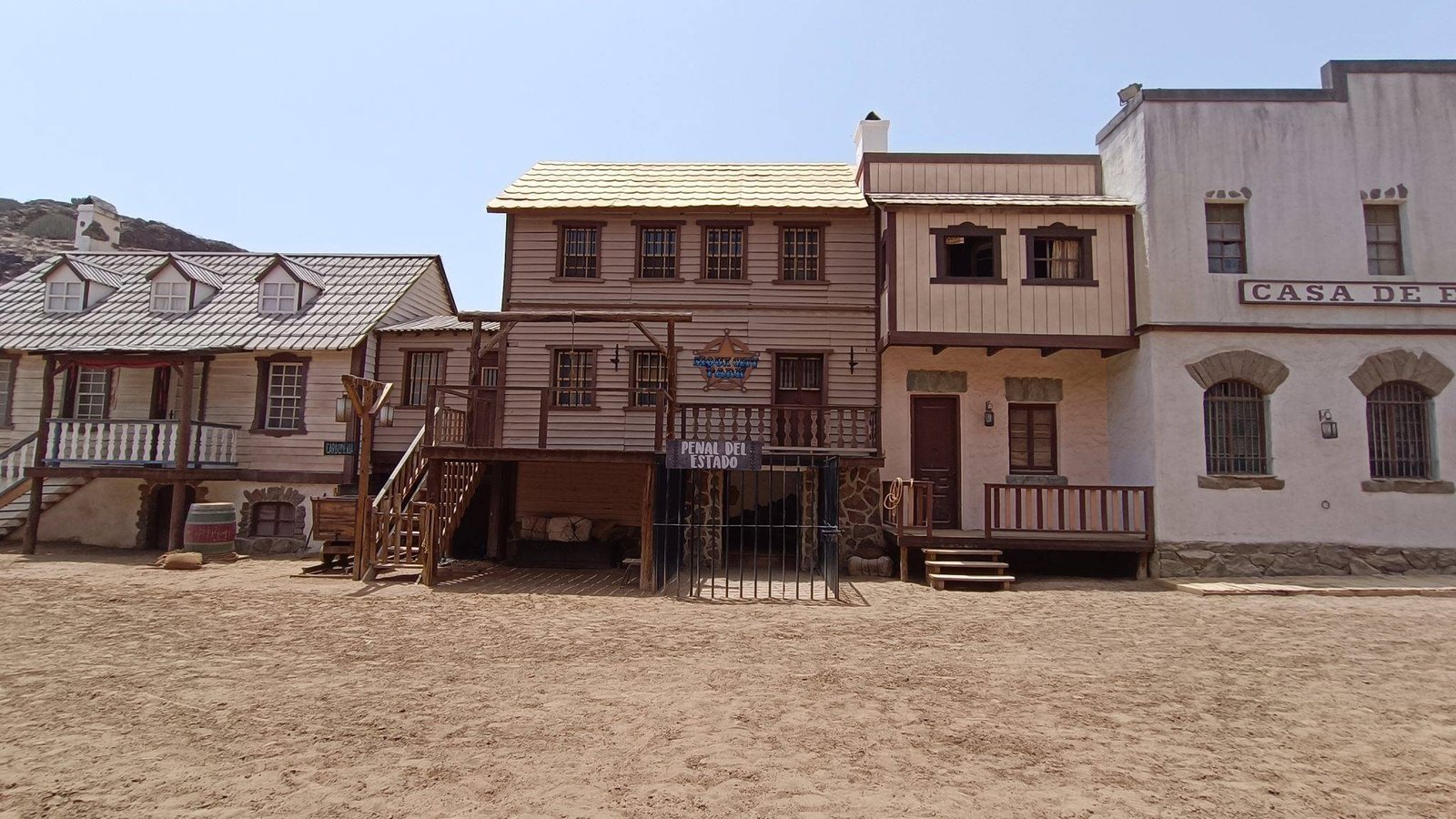 On the main street you can find a school, a barber shop, a blacksmith shop and a western saloon, with a church and a cemetery in the back. There is also a Mexican village and an Indian reservation nearby. Country music is playing in the saloon, and a fight breaks out when shooting suddenly starts. It invites visitors to experience the feel of the old wild west life.