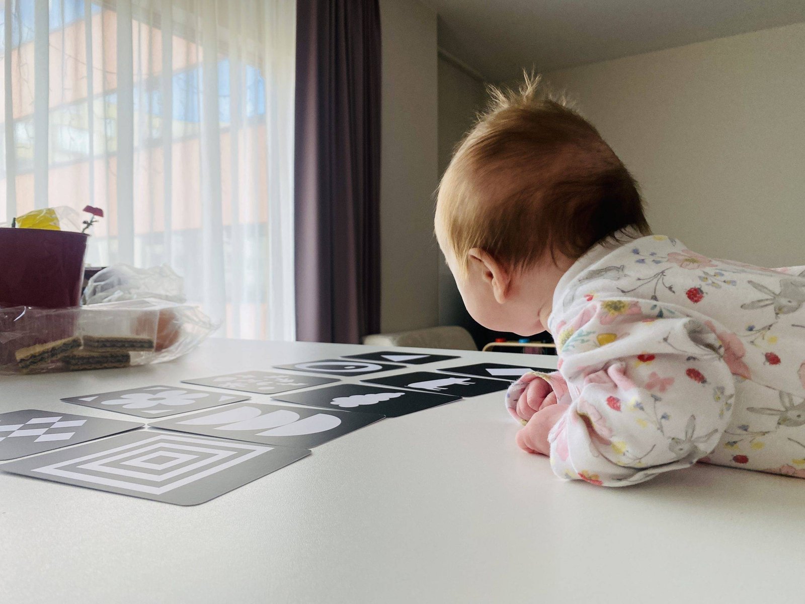 When the baby is already used to lying on his stomach and is interested in contrast cards, you can have a minute free for yourself. Simply place the contrast cards in front of the baby lying on his tummy.