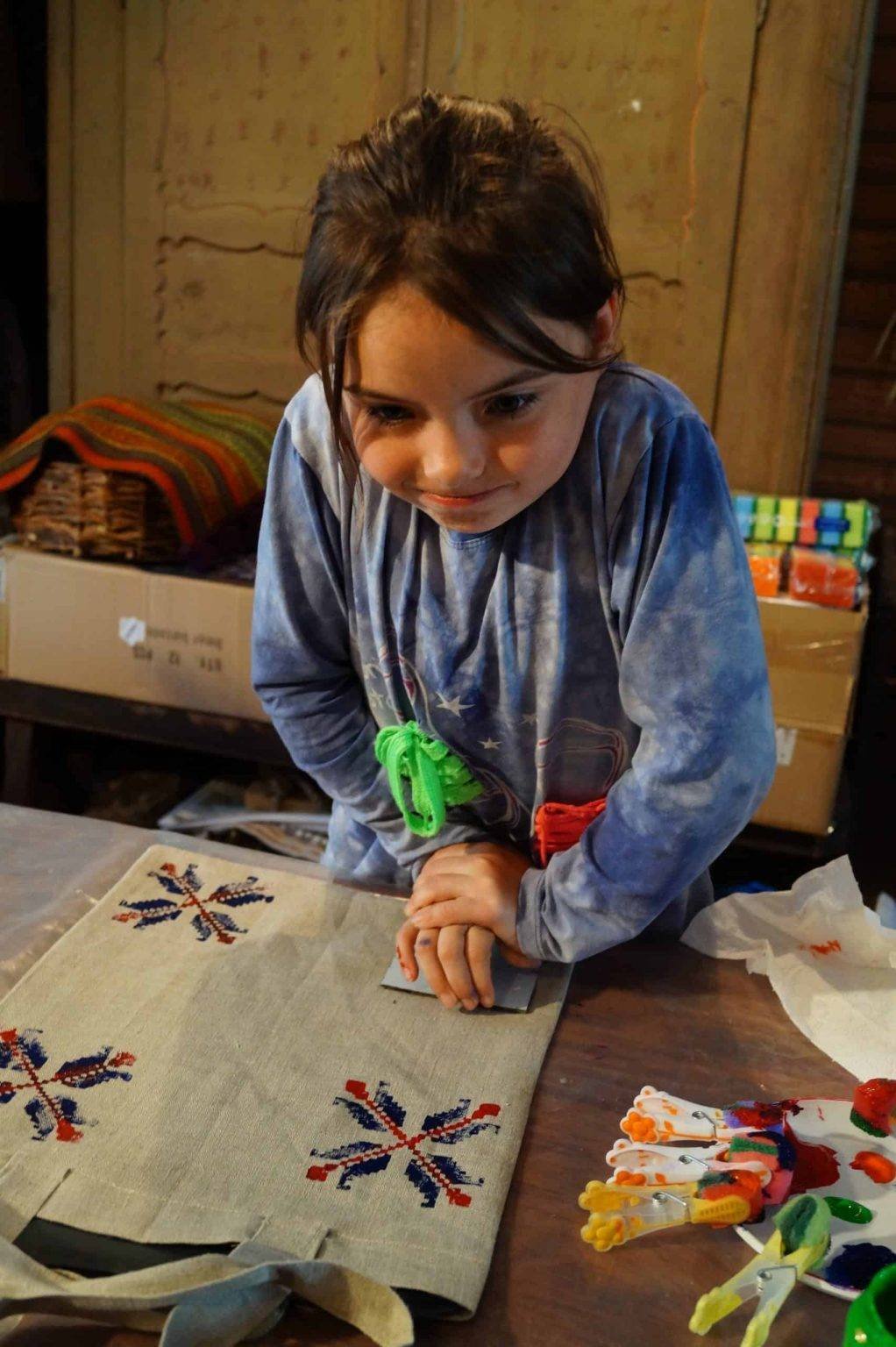 The participants of the activity are introduced to flax, wool, hemp, nettle fibers and their use in traditional culture. The linen shopping bag is decorated with fabric pattern motifs from the Jonava region.