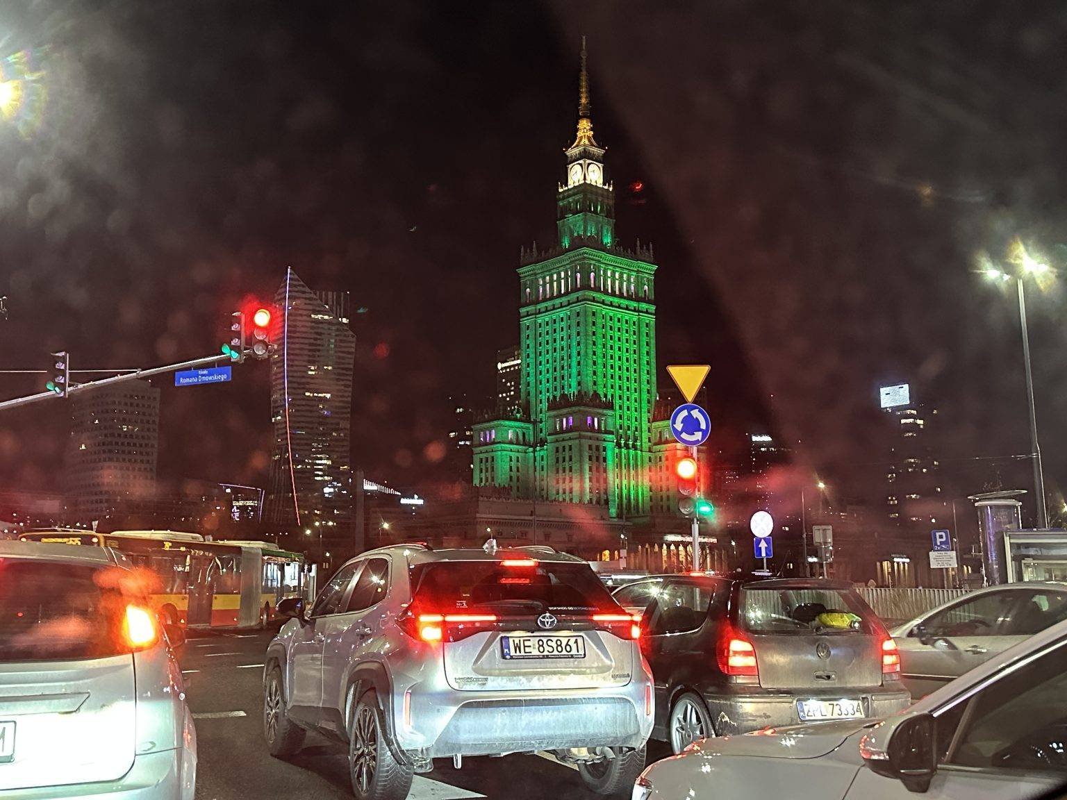 Marszalkowska Street is next to the palace, with many shops and popular hotels. On the other side is Emilii Plater Street and Warsaw’s skyscrapers, the Zlote Tarasy shopping centre, and the bus and train stations.